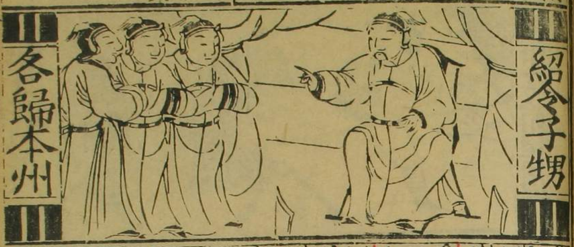 Viên Thiệu sai con và cháu trở về châu. Bản in Tam quốc diễn nghĩa khoảng năm 1664.