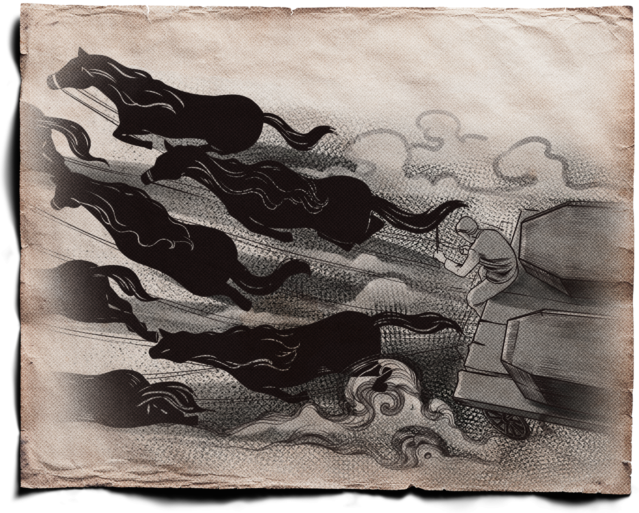 Cửu bước lên xe tang, bên trong quan tài đá khá rộng rãi, có một cái chiếu thêu rất đẹp, gối gấm và một cái mền, Cửu nhìn thì thấy chẳng khác gì đồ táng chung với quan lại quý tộc xưa cả. Vừa nằm xuống, Cửu liền thấy buồn ngủ, cố gượng mi mắt cho tỉnh táo nhưng vô ít. Lát sau, Cửu nghe tiếng ai đó gõ lên quan tài rầm rầm, thì ra là ông xà ích. Ổng chỉ nói ngắn gọn: